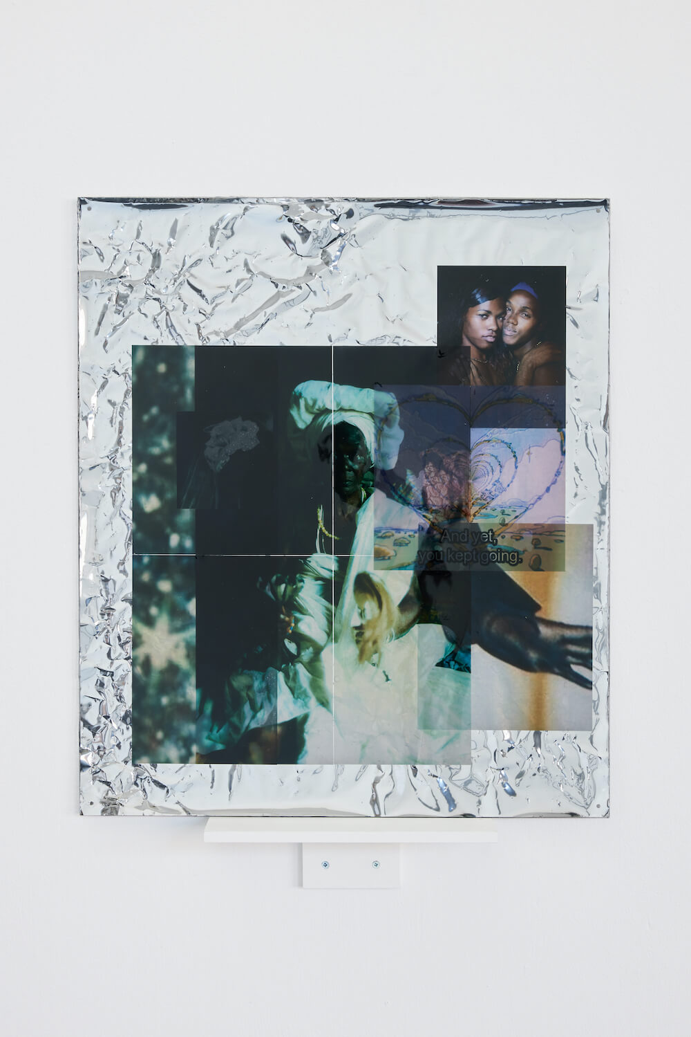 With the series of works, they follow on from the VO Curations 2022 show and they explore a method of visual collaging, and using the still images in my archive. I’ve used them to make video work as you saw, and then also alongside performances. I wanted to keep on using the material in the archive outside of these two avenues, I started making collages and at first I had to also write notes and try to think about how to get an audience to write a pathway through the images and the text to reach a certain point or to feel a certain thing. That’s still my main concern, well, at least one of my main concerns with image work, my image work is thinking about how to allow the audience to take themselves on a journey through the debris or deluge of images. With the work in the show specifically, I think I was thinking a little bit about desire, but also thinking about the ways that one is perceived and the ways that one responds or has a posture of response in relationships. There’s a few works across the show that deal with that. Then, also I think it’s about exploring some sensations or emotions that reoccur in my life. There’s little moments like that, but also technically I wanted to explore more transparency and layering in the work. There’s works that are really bare and you can see the surface, then there’s others where they’re layered on top of each other and the image really transforms the one underneath, thinking again about how to put the image in relation to each other so that a journey can be taken through these different node points in the work.
