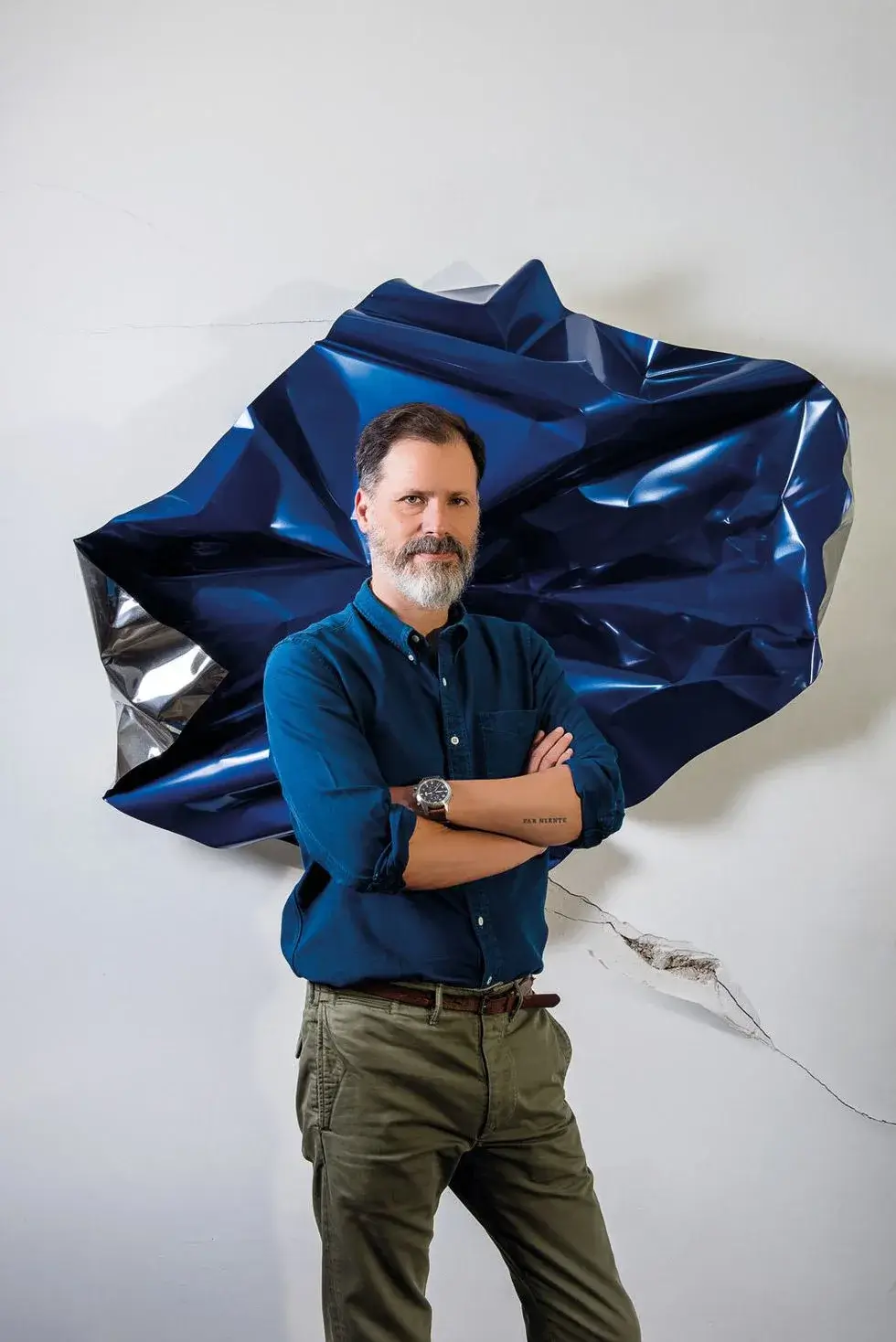 Chaparro’s approach to creation is deeply intuitive. His iconic bent steel sculptures are shaped through direct physical interaction with industrial steel sheets. This transformation process results in violent yet precise forms that contrast with the sleek, machine-made quality of the material. These works can be seen as self-portraits, reflecting the artist’s energy in the act of creation. In his column sculptures, Chaparro works with wood joists, often partially burning them before sculpting the charred remnants with a chainsaw. These totems explore the delicate balance between fragility and strength, while embracing Zen principles of negative space and simplicity. They evoke a sense of timelessness and stillness.
