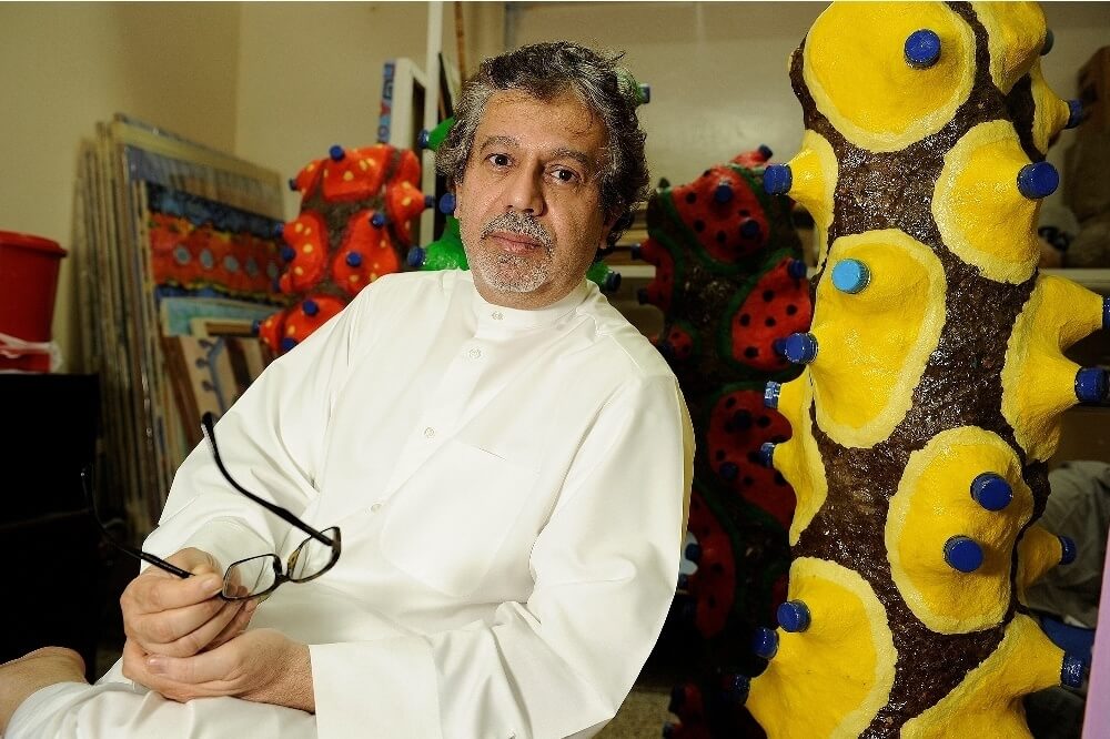 One of the five pioneering conceptual artists from the United Arab Emirates (UAE), Mohamed Ahmed Ibrahim is well-regarded for his work inspired by the landscape of his country. Ibrahim was part of the first generation of contemporary artists alongside Hassan Sharif and Abdullah Al Saadi to emerge from the country in the late 1980s, at a time when the visual arts weren’t valued. Ibrahim won the first prize for Sculpture at the Sharjah Biennial in 1999 and 2001. His work demonstrates his interest in the barren, rocky landscape of the UAE. Handcrafted objects like in his sculpture Untitled (2020) look like primitive tools or bones and give the appearance of archaeological artifacts. His works on paper including White Form on Black (2016) have writing and shapes evocative of cave paintings. His work has been exhibited at the Sharjah Biennial and Venice Biennale and is in the collections of Mathaf: Arab Museum of Modern Art and Sharjah Art Foundation.