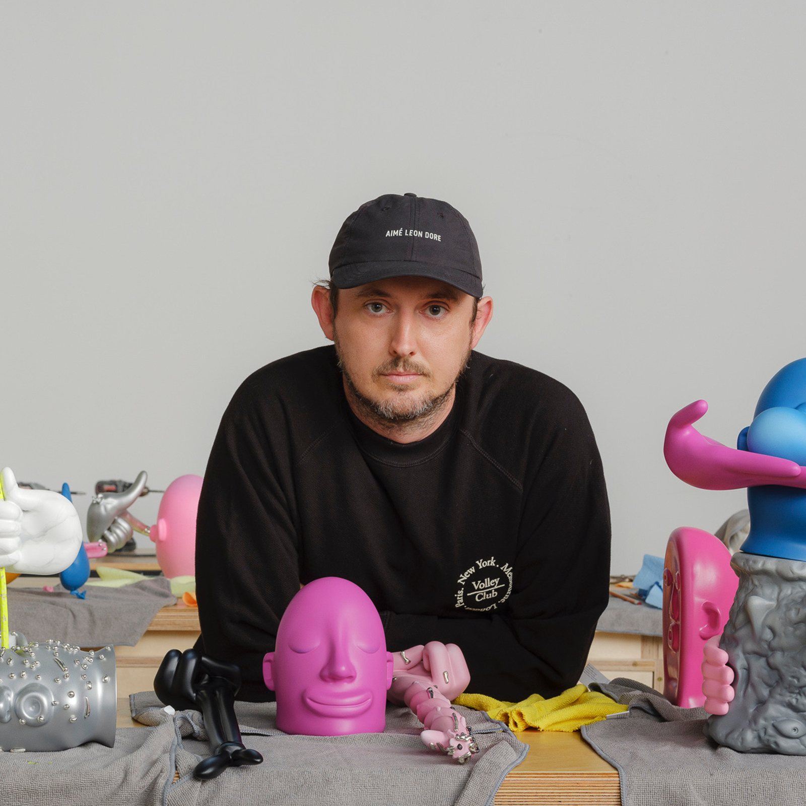 Mark Whalen’s versatile and interdisciplinary practice explores sculpture, painting and video, with scales ranging from small table-based works to large immersive sculptures. Whalen’s maquettes are realised in the digital realm, intentionally without gender or physical body, then fabricated with polyurethane and chrome on cast aluminium and spray-painted. In fluorescent hues, the distinctive and exaggerated facial characteristics and body language are comical, while concurrently shifting under the weight of social anxieties. The resulting figurations are part of an overarching narrative: each body part belongs to a single fictional protagonist, cumulatively representing the vast spectrum of human emotion.