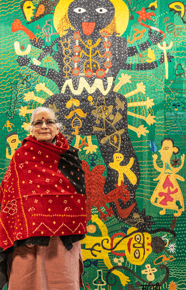 Madhvi Parekh lives and works in New Delhi. Madhvi’s traditional representations revolve around her childhood memories, Indian mythology, women’s craft, art and folk legends, all of which are aimed at narrating a story or a life experience. As a self-taught artist, apart from folk motifs and figures, she also uses imaginary, dream-like characters and spiritual abstractions that celebrate the male-female and real-surreal dichotomies.
