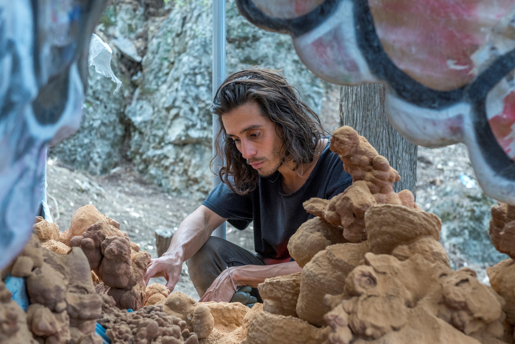 Adrián Villar Rojas’ artistic production exists in an imaginary dimension where men face their obsolescence and eventual extinction, playing with perceptions of time and its representation in human culture. Villar Rojas uses aspects of drawing, sculpture, music, science fiction and installation to create dream-like alternate realities that allude to an apocalyptic or mythological end of the world. Often working in clay, his installations are colossal and immersive, provoking sensations of unease for their embodiment of both physical and temporal immensity; the objects he creates seem at once timeless and ancient, relics from an ambiguous future or past that question our notions of time, history, and modernity.